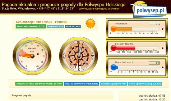 Serwis pogodowy w portalu Polwysep.pl. Prezentowane na stronie prognozy zawierają informacje o temperaturze, ciśnieniu, prognozowanych opadach oraz wietrze dla Półwyspu Helskiego i okolic. Ogromnym atutem witryny jest czytelny i prosty layout oraz aktualizacja, co 5 minut. - http://www.pogoda.polwysep.pl